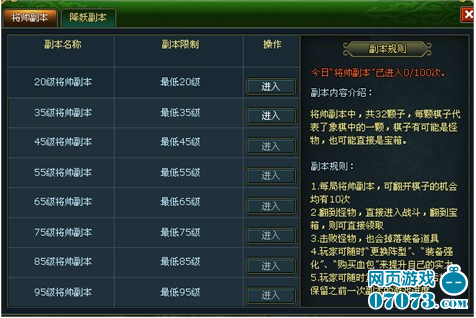 到了108将的中级试炼阶段,玩家应该已经能进入副本了。这108将游戏里有两个副本,分别是将帅副本和降妖伏魔。其中将帅副本是用来打装备的副本,只要20级就可以进去了。而降妖伏魔里则是获得一些技能等级升级的道具和技能书,运气好还可以获得元神。但是降妖伏魔却需要25级才能进去。