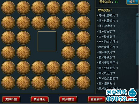 进入副本之后,右边显示了可以获得的东西,左边则是盖上的象棋。能获得什么东西,除了看运气之外,还要看实力。无论翻出什么棋子,都是要战斗胜利之后才能获得其相对应的装备。而每次探索只有10次翻棋机会。加上每天只能进入该副本10次,也就是说,每天你有100次免费的机会来获得装备。如果打不过或是没血了,好吧,你只能进行装备强化或是购买血包了。在进入之前,自然是最好将血包补满并且将装备强化好才行。