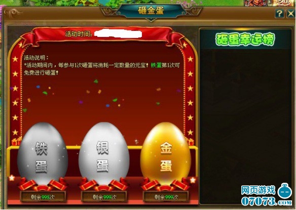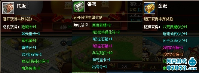 活动期间,消耗一定的元宝便可砸开内含神秘礼物的蛋蛋(分铁蛋、银蛋、金蛋三种),不同的蛋砸开后会有不同的奖励,想知道都是哪些给力奖励嘛,快到游戏里去砸蛋吧~
