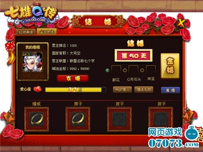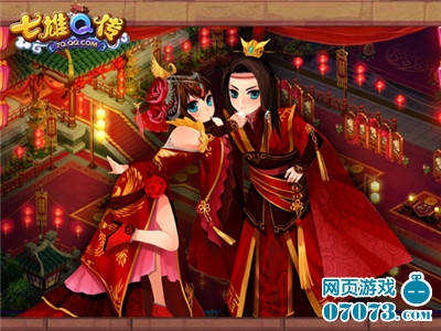 在全新结婚系统中,君主等级达到30级后,女性君主可前往月老处报名向天下英雄发出征婚信息。在征婚期间内,男性君主可前往月老处向心中的女神求婚。君主们可以花费不同的资金发起求婚攻势,用自己的浪漫,用自己的诚意感动美人。求婚成功后,新人们将举行盛大的婚礼,在万千玩家的见证下缔结这来之不易的爱情果实,带上象征爱情的婚戒,享用专属的夫妻特权。“我们结婚吧”,一句简单却意味深长的话语,正是《七雄Q传》趣味公测所要带给玩家的祝福,让君主们告别单身,在公测中美人相伴,趣味游戏。