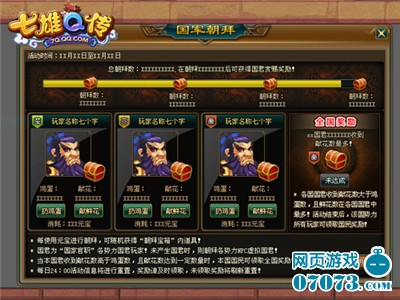 《七雄Q传》的君主们将在公测期间迎来激动人心的天下第一国君赛。在国家官职中胜出的国君,可以受到本国及他国国民朝拜,而在朝拜的时候当然不会只有鲜花,还会遭受“扔鸡蛋”的惩罚。在公测首周将有两期的比赛,最终收到鲜花最多的国君所在国的国民,可以额外获得丰厚奖励。看来玩家们在公测期间不仅要做好国民去“献鲜花”,还要有组织的去当“坏邻居”给对手国君“扔鸡蛋”了。