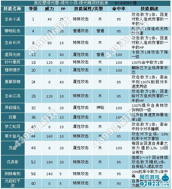 奥拉星绿光兽,绿光小灵,绿光精灵亚比,下面就看看奥拉星绿光兽,绿光小灵,绿光精灵的进化图、技能表和种族值吧。