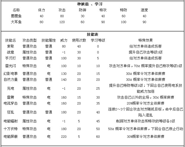 奥拉星圈圈鱼,大耳鱼的进化图,技能表,种族值