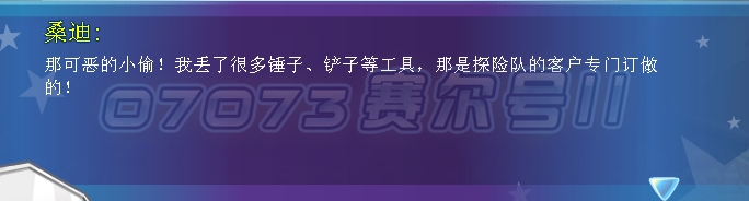 根据帝兰提供的线索,在爱因斯坦基地、路丝道具店、杰克家具店都发生了失窃案,快去找桑帝,露丝和杰克了解一下情况吧