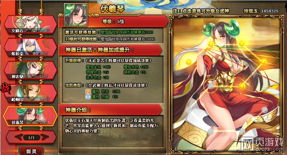 3.伏羲琴:又一实用女武神,铜钱的主要来源之一。续崆峒10级后,的继续点满级。