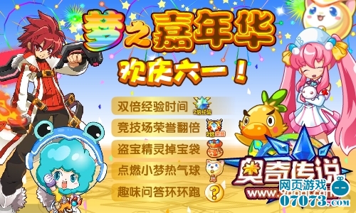 六一又到啦!奥奇城举行盛大的梦之嘉年华,众多NPC,众多可爱精灵与你一起欢度!上线经验双倍、竞技场挑战荣誉翻倍,还有点燃小梦热气球、寻找盗宝精灵、小屋串门占卜、趣味答题环环跑,赢取梦之奖券,兑换丰富礼品!还等什么?一起来奥奇传说,参加六一盛典吧!