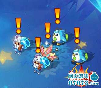 当小奥奇开始和幻冰冰的游戏以后,会进入到幻光冰原的一个场景里,幻冰冰会被她的小保镖十六和绿叶鸟围在中间。对于十六和绿叶鸟,小奥奇们可以无视他们,我们只需要专注于攻击幻冰冰就好。