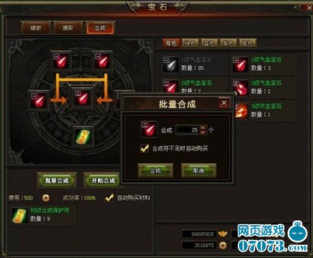 2、宝石合成并不是100%成功,成功率与宝石数量、是否加入合成保护符有关:4颗宝石加上对应的合成保护符可100%成功。合成失败,参与合成的材料将全部消失。