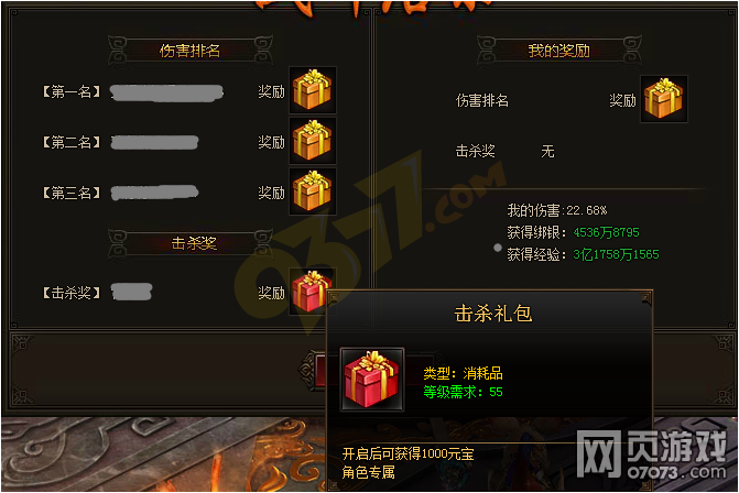 普通奖励为大量绑银和大量经验值(按照玩家对BOSS伤害百分比计算),举个例子,对BOSS造成4.7%的伤害,获得绑银946万,经验6622万,奖励的确是非常的多的。不仅如此,伤害排名奖励更为惊人,第一名奖励法宝碎片80,第二名奖励法宝碎片40,第三名奖励法宝碎片20,按照商城价格,第一名奖励值8000元宝。最后的击杀奖励直接奖励元宝1000