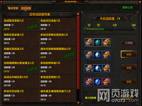 活跃度就是每天需要完成一些指定的事情来达到一定活跃值,通过活跃值的多少来领取一些奖励。