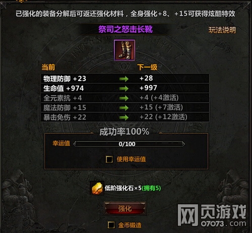 小提示:装备强化有一定几率强化失败,强化失败后会增加幸运值,幸运值满100后,下次强化将百分百成功