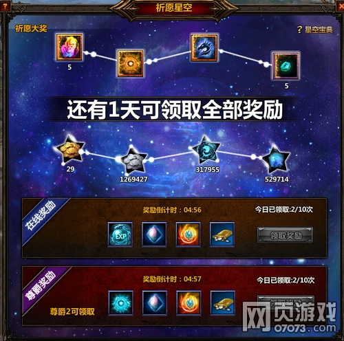 5、新增每日在线奖励“祈愿星空”,每次领取可提高总奖池道具量,倒计时结束更可获得大奖及奖池所有道具。