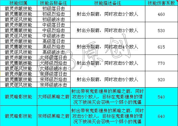 下面我们先来看下箭灵的几种英魂在猎场的技能及伤害系数,其中稀有箭灵暗影的攻击虽然不高(540),但附带技能特效,可以召唤弱小傀儡,能稍微延缓一下对方的进攻。