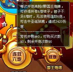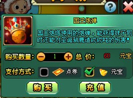 国王炮弹可以打中圣诞驯鹿,然后扣除相应的血量,打完应该也就可以领驯鹿回去了,国王炮弹60元宝一颗