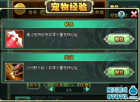 1. 宠物升级 — 通过宠物修炼或出征讨伐偷猎势力可以增加宠物经验,提升宠物等级。