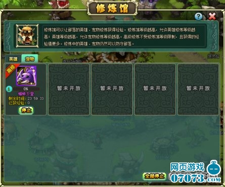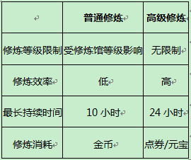 宠物可以在修炼馆中消费金币或元宝进行修炼,分为普通修炼和高级修炼,普通修炼升级受到修炼馆等级限制;修炼馆的等级越高,允许宠物修炼的等级越高。高级修炼无等级限制,但需要花费元宝进行,获得经验提高20%。