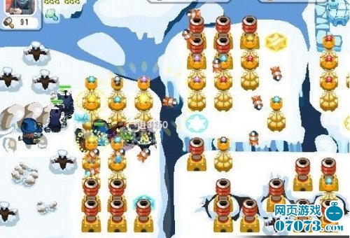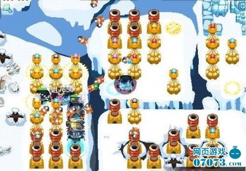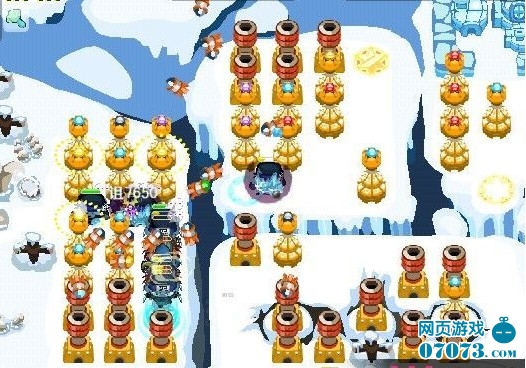 7)后岛,我设计的是4塔5格路线,1排火镶嵌还能帮助中上岛辅助攻击,以及作为最后防空的一道壁垒。牺牲在后岛多造2个塔的代价,让路线多走2格,让中上岛和中下岛的炮塔也可以有时间有所作为。我觉得3格路线实在太短了~~~