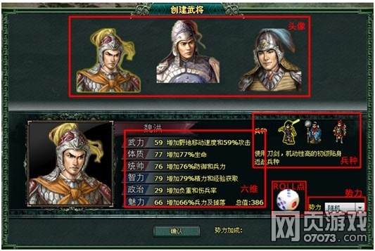 开始ROLL的六维,单项属性最高为80,总值理论最高480。不过这是理论,可能你一个礼拜都ROLL不到。属性重要性目前来说:统率=魅力>武力>体质>智力>政治,不过不排除以后更新后智力及政治属性重要性超越前两者。一般来说你前4个属性都超过70就够了。
