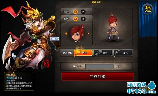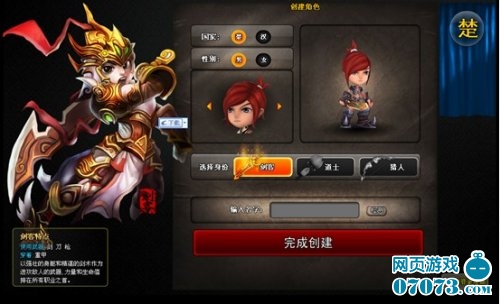 玩家可以在创建角色界面选择自己喜欢的阵营、性别、角色形象、以及职业,并输入自己的昵称,点击完成创建,如果输入的名字合法,则角色创建成功。
