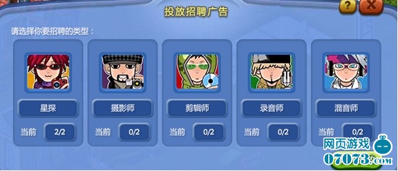 2、招聘时,有“星探、摄影师、剪辑师、录音师、混音师”供玩家选择。