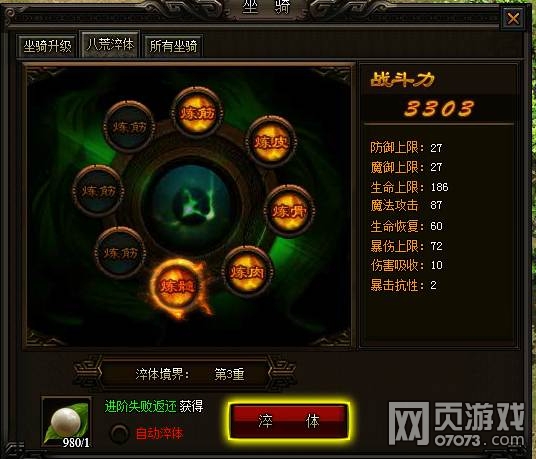 3.进阶不是必定成功的,但是进阶失败我们会返还给您坐骑炼骨丹,使用坐骑炼骨丹同样能提供给您强力的属性