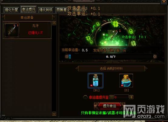 项链,帽子的幸运无法通过祝福油提升。武器跟衣服要非绑定的才能提升幸运。