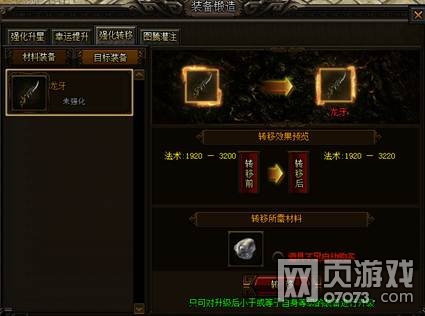 将一件装备已强化的次数转移到另一件装备上,根据已强化的次数消耗不同的材料