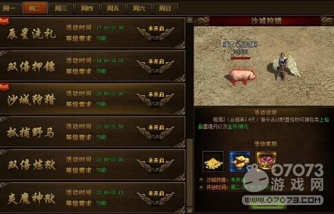 沙城狩猎,每周二开启,通过猎杀野兽可以掉落gelei上仙品兽魂丹和金币绑元。