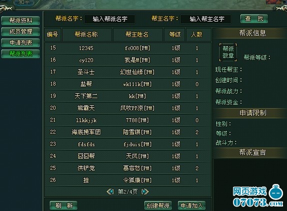 申请加入:当玩家等级达到15级时,可以在帮派界面选择帮派申请加入,申请后出现在帮派的申请列表,由长老以上官员决定是否同意申请
