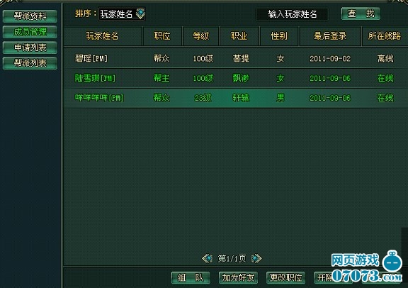 显示帮派所有成员的基本资料,包括职位、等级、职业、性别、最后登录时间