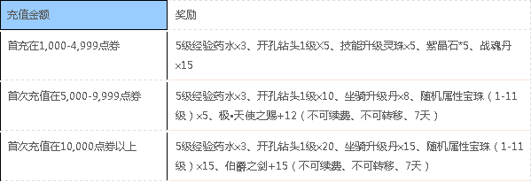 活动规则:在活动期间,玩家首次充值金额达到相应点券,即可获得豪礼一份。