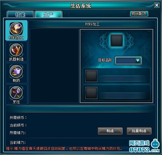 技能包含采集、材料加工、武器制造、制药、烹饪(暂未开放)。
