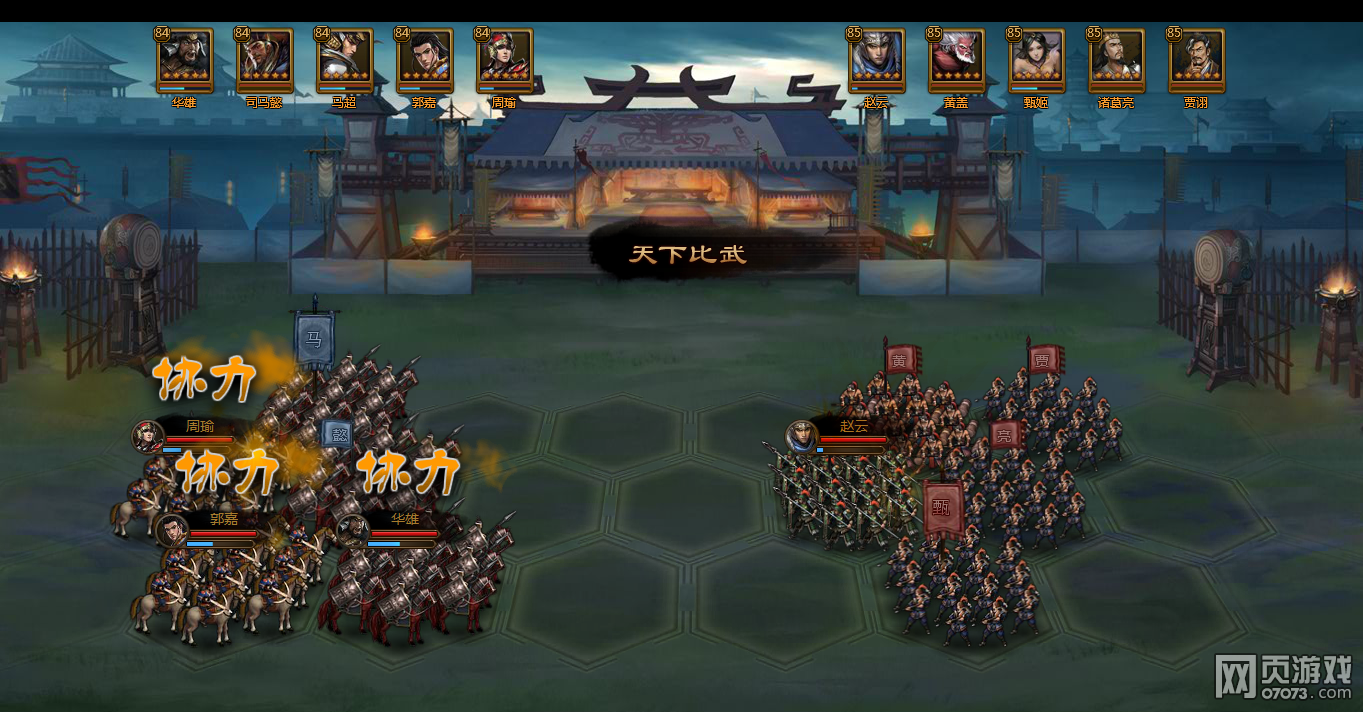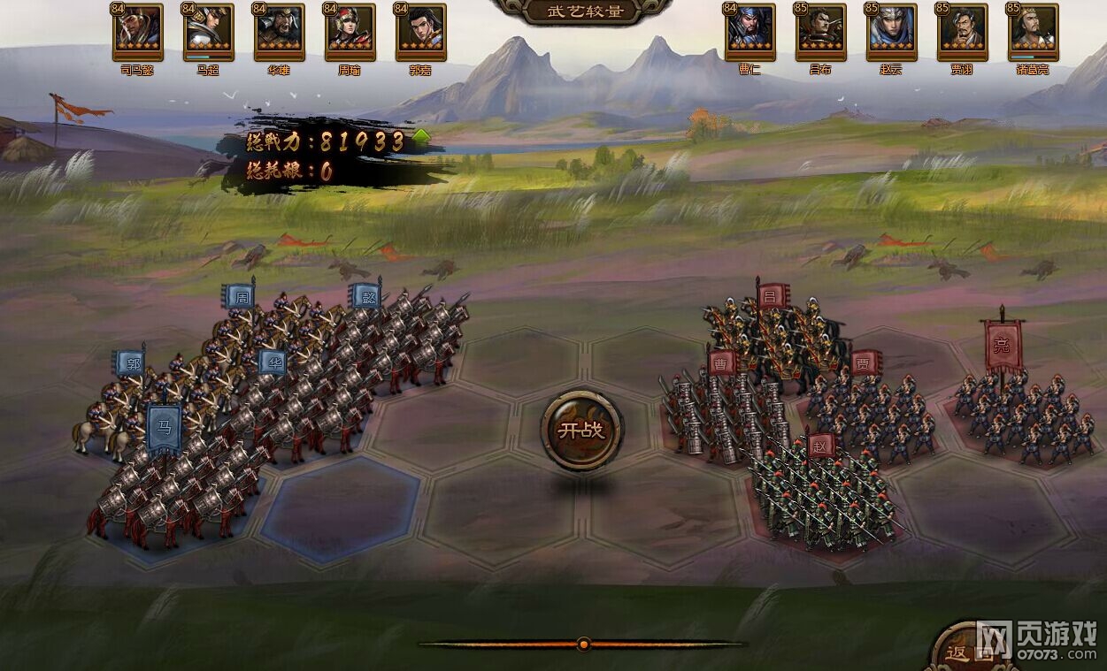 对与骑兵,重弩永远是我们的噩梦,如何避免,我们就从布阵上做文章,所有武将靠后站位,这样使对手前排近战至少有一个人第一回合轮空,至少一个远程重弩第一回合轮空,那么胜负已分,我会在下面贴出几个图供大家参考,记住要想赢步兵一定要靠后站位,利用步兵腿短最多走2格且速度快的特点防空一回合