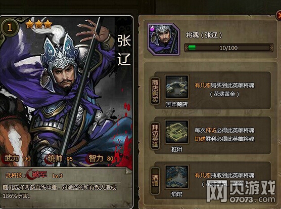 优点:张辽的三围同样很高。速度比二哥更快。技能伤害是在三条直线上随机选取两条释放。群体伤害相当可观。而且升4星并不困难,在切磋以及拜帖的支持之下。很快就能升星。