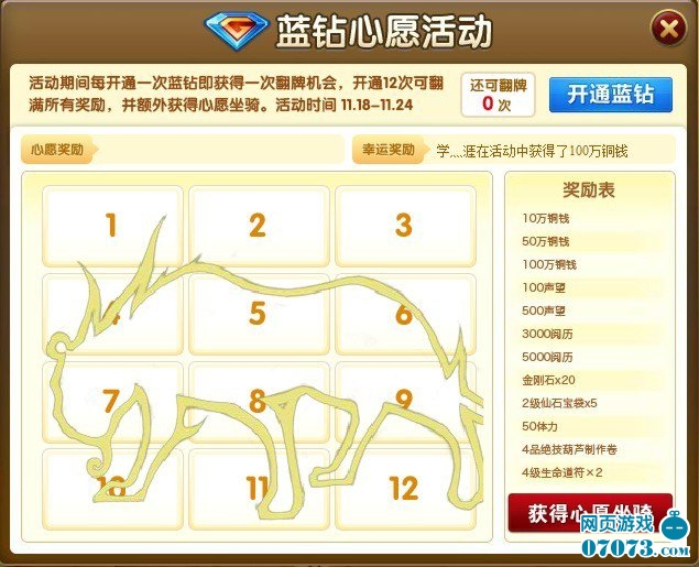 11月18日-11月24日,从QQ游戏大厅登陆大话神仙,即可参加蓝钻心愿活动,通过游戏内的“蓝钻翻牌”按钮进入活动页面开通蓝钻,或为好友开通蓝钻,即可获得一次翻牌机会,开通12次即可获得所有奖励,并额外获得蓝钻心愿坐骑—恶魔猎豹一只!