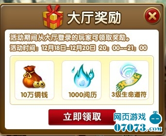 为答谢QQ游戏各位仙友对大话的支持与厚爱,12月18日-12月20日,每晚20:00-21:00,从QQ游戏大厅登陆大话神仙,即可领取包含铜钱、阅历、道符等丰厚奖励!