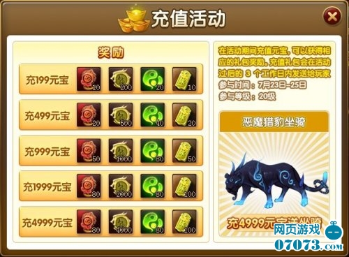 2、大于等于指定标准内即可领取该阶段的活动奖励,例如:充5000元宝也可领去4999的奖励,充3000元宝也可领取1999的元宝奖励。(每个玩家以最大累计充值金额为准,每人仅可领取一个阶段的奖励)