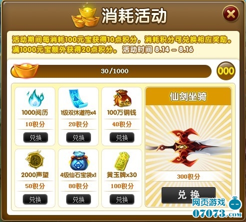 8月14日10:00起,我们开启全平台的消耗活动,活动期间每消耗100元宝即可获得10积分,满1000元宝还将获得额外的20积分,积分可以用来在活动界面兑换相关的道具奖励