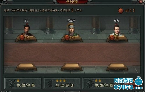 举办不同的宴会节目,满足名士心愿可获得一定的将魂。