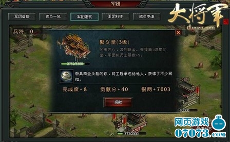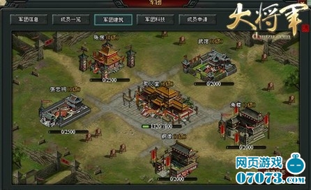 另外,每提高1级武馆,国战时全团成员兵种攻击+10;每提高1级角楼,国战时全团成员兵种防御+5;每提高1级铜像,国战时全团成员兵种生命+20;每提升1级账房,领取粮食资助额外提高10%;每提升1级褒忠祠,领取功勋资助额外提高10%。熟悉这些建筑的用途,就可以合理的安排建筑升级顺序。