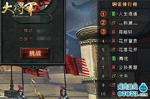 国战无疑是许多善战将军的最爱,不过国战过后还是有很多将军战意难平,渴望与高手对战的欲望更胜。“画”时代即时国战策略页游《大将军》中,为热血将军量身打造一座PK台,台内高耸一座英雄榜,,将军在铜雀演武中厮杀拼搏后,可以清楚的了解自己排名,查看对手的排名和资料。随时随地调整策略,更有针对性的备战!你准备好一展身手了嘛!