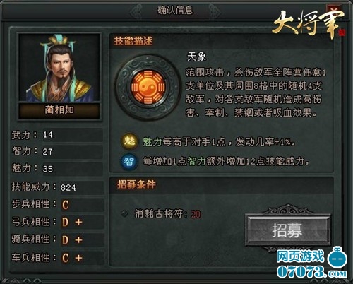 蔺相如多谋善辩,胆略过人;他以国家利益为重,善于人和,不畏强暴,出使秦国,留下了流芳千古“完璧归赵”的故事。他为了国家利益,忍辱负重,使大将廉颇“负荆请罪”,更演绎出“将相和”的典故,为历代人们所传颂。《大将军》继白起和孙膑之后,迎来又一全新武将——蔺相如。