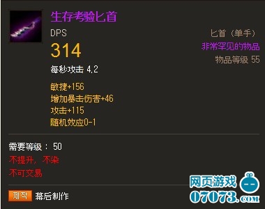 地城之光生存考验匕首单手匕首属性介绍 地城之光生存考验匕首更多信息: 最大提升等级+7 地城之光生存考验匕首分解信息: 分解材料:加强的粉末; 可能性:100% ; 数量:3-6
