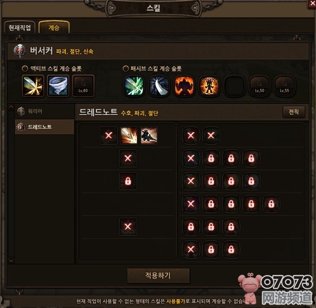 技能继承图上显示叉叉的是不能在当前职业下使用及不能继承。一把小锁的是说明没有学该技能。