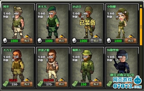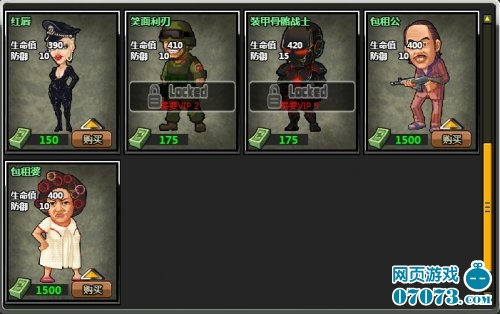 弹头联盟网页游戏商城中可以购买不同的人物,购买后不仅人物外观有着非常大的变化,还会为玩家增加不同的属性。弹头联盟人物设计方面还是非常搞笑的,彪悍的士兵、凶狠的包租婆一应俱全。赶快随小编一起去看一下吧。