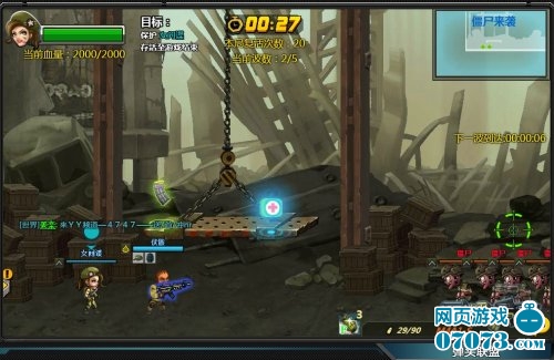 女间谍上方会固定刷新弹夹和医疗包,供玩家补充。随着等级的提升玩家将会接触更高级的僵尸来袭关卡。高等级的弹头联盟僵尸来袭不仅刷新僵尸的传送门数量增多,僵尸的种类也会增多,更加难以对付。