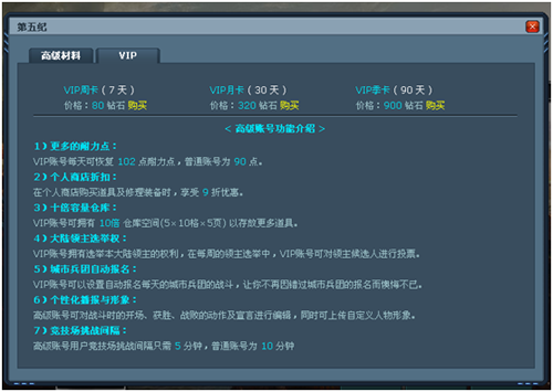 1)周卡:7天的VIP账号时间,价格80钻石;