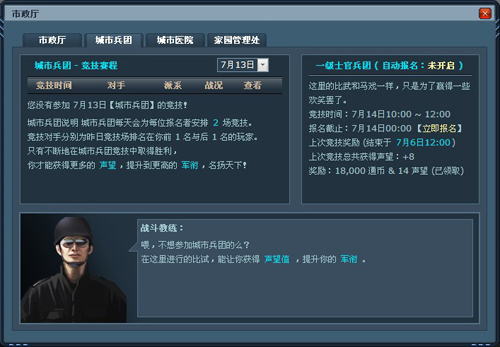 参加城市兵团角斗,是获得声望、提升军衔的主要途径。声望决定你的军衔,提升军衔能给你带来许多好处,详见“军衔”节。