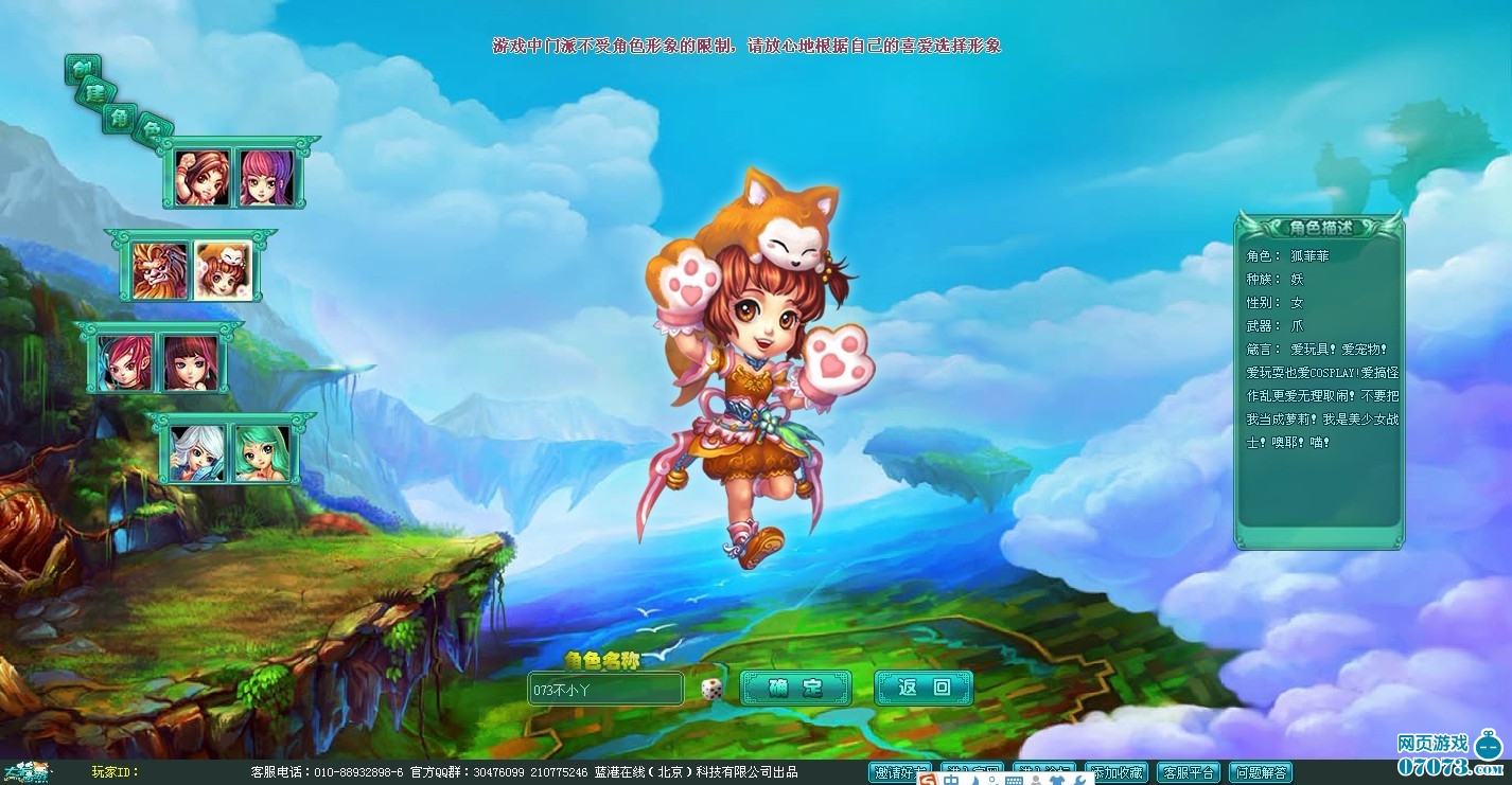 角色创建界面,点击创建角色按钮,出现如下界面,选择你喜欢的角色形象并输入您喜欢的角色名称,如一时角色名不知如何决定,可以点击文本框后面的小骰子,随机生成超炫角色名。