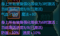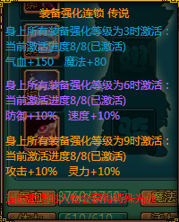 2.当玩家全身共8件装备强化等级同时大于等于6时,中级装备链锁将被激活,获得初级与中级链锁装备特殊加成及中级人物光效。
